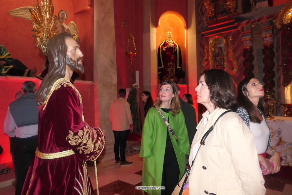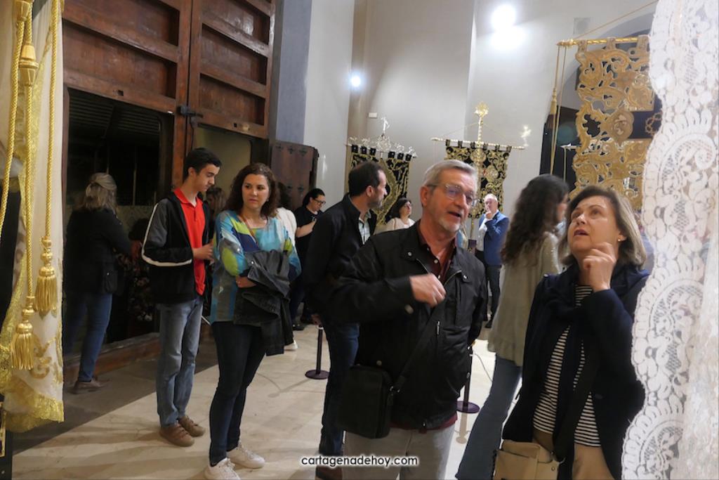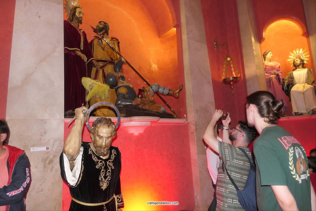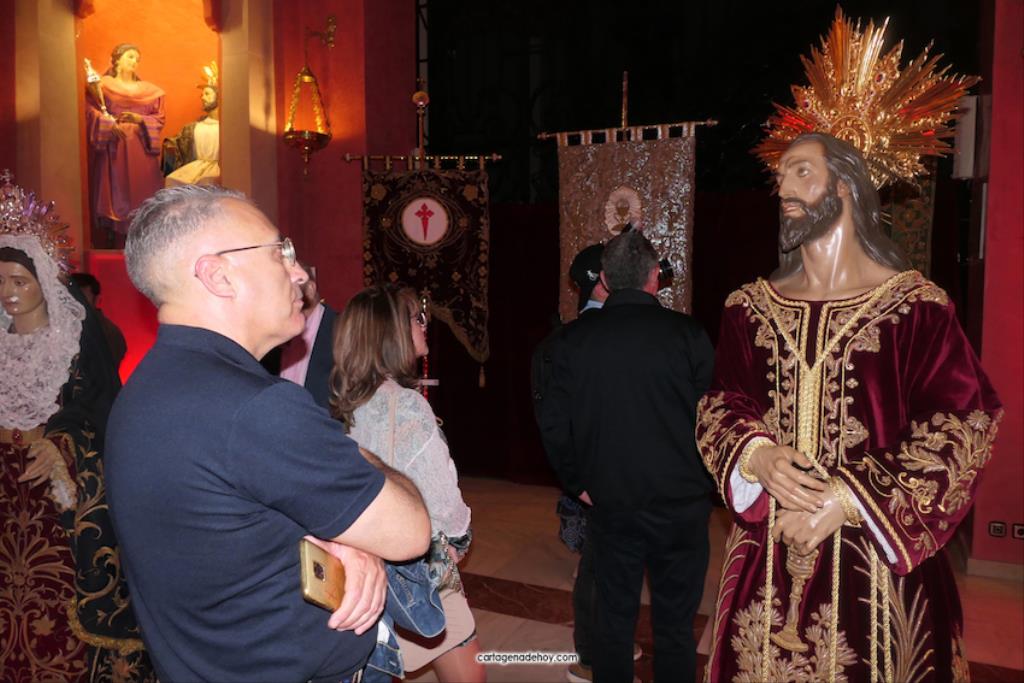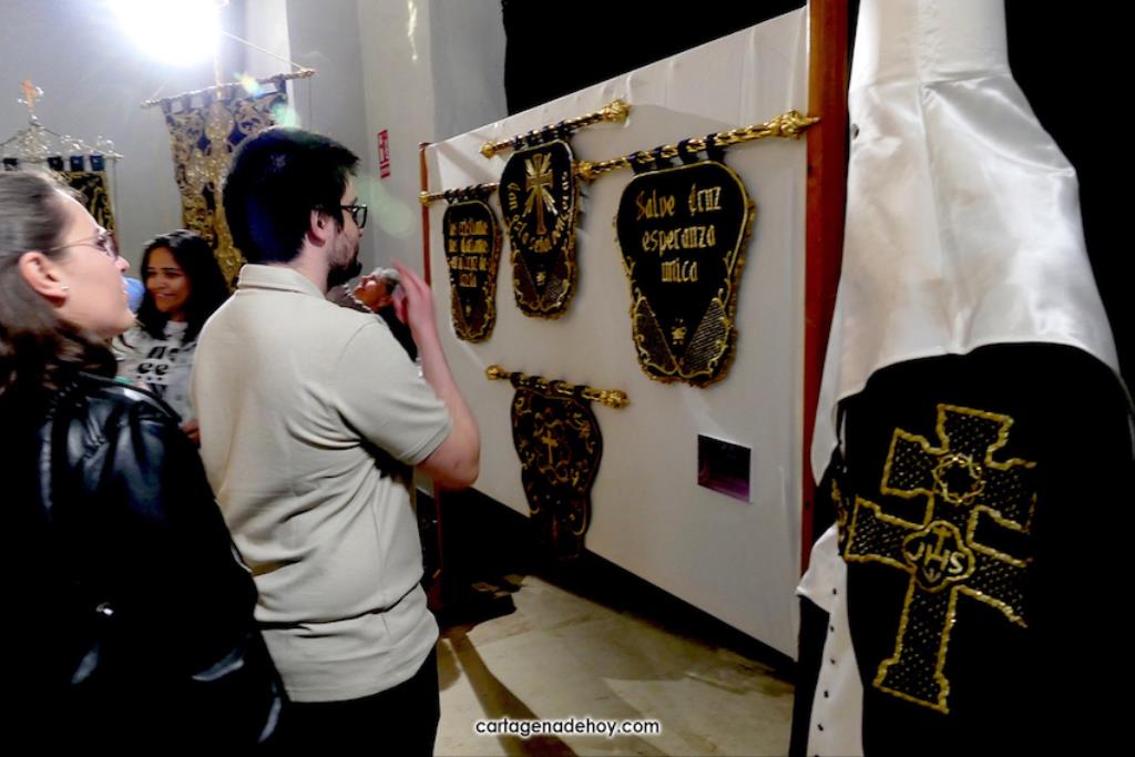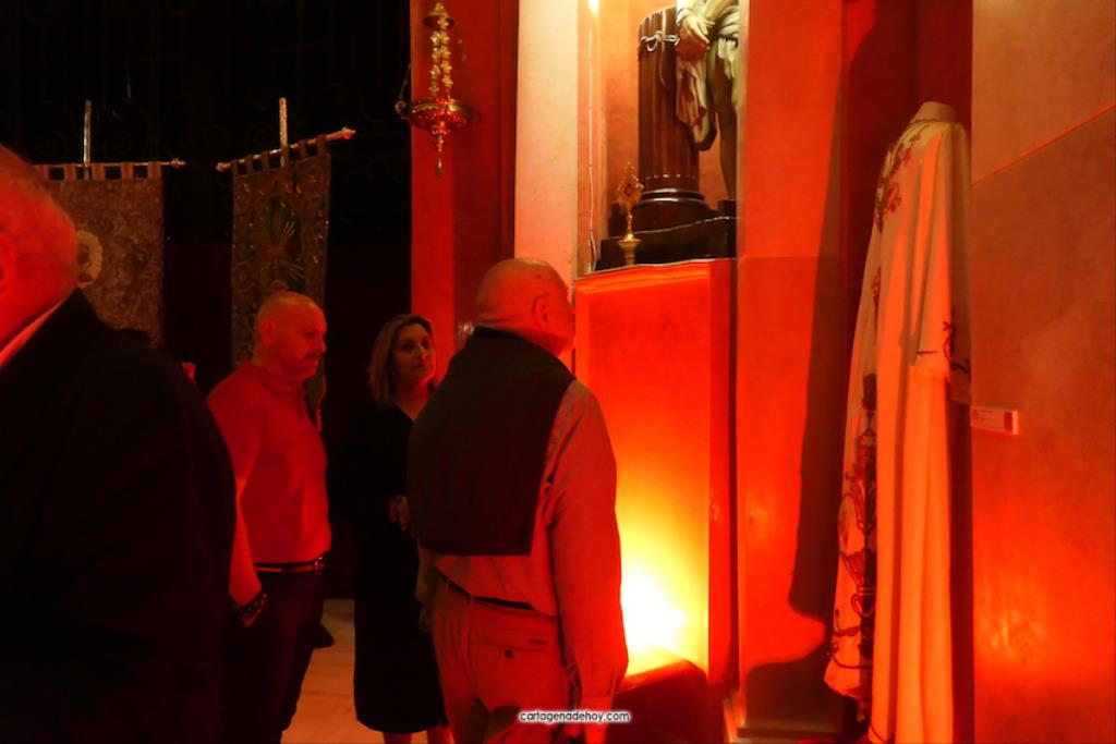 Una tenue luz en la oscuridad acompañaba la visita al Resucitado y algo similar, pero con su típico color encarnado, se daba en la Cofradía del Cristo del Prendimiento, cuya espacio museístico era la sala capitular y la capilla, donde se podían observar de cerca varias de las tallas más emblemáticas, entre otros enseres. Los hermanos californios no escatimaban explicaciones con infinidad de detalles de las tallas, túnicas y otros datos relacionados con la muestra.