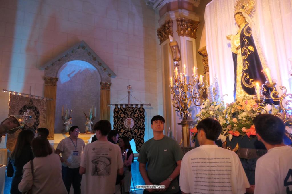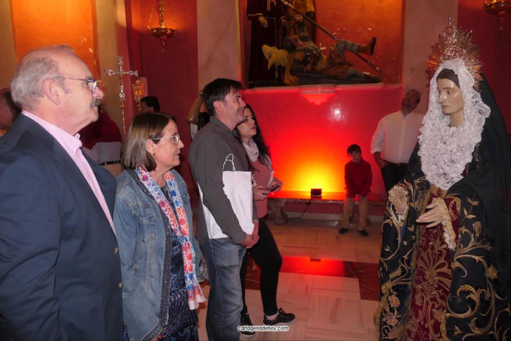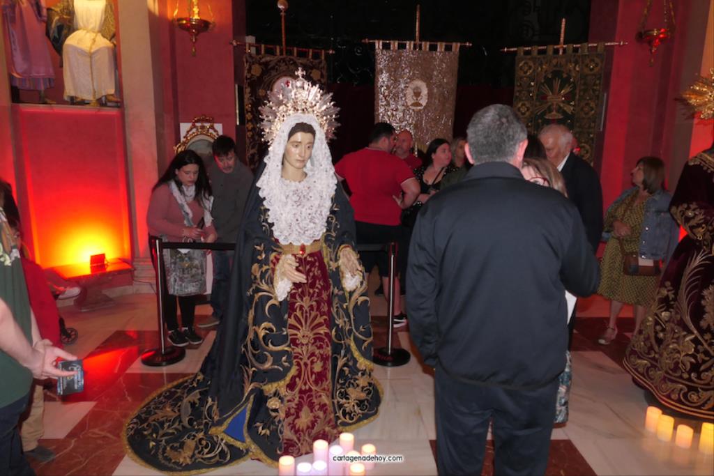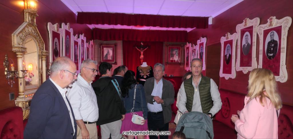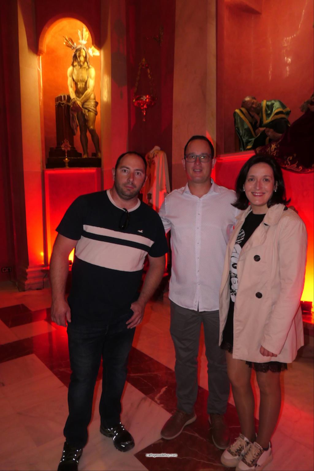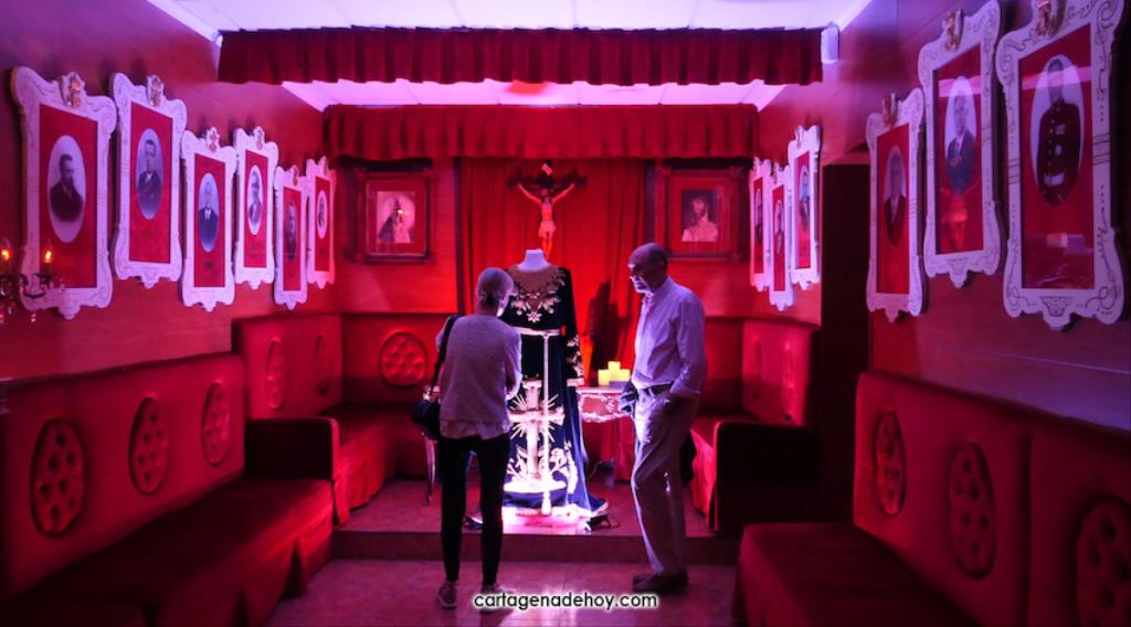 Una tenue luz en la oscuridad acompañaba la visita al Resucitado y algo similar, pero con su típico color encarnado, se daba en la Cofradía del Cristo del Prendimiento, cuya espacio museístico era la sala capitular y la capilla, donde se podían observar de cerca varias de las tallas más emblemáticas, entre otros enseres. Los hermanos californios no escatimaban explicaciones con infinidad de detalles de las tallas, túnicas y otros datos relacionados con la muestra.