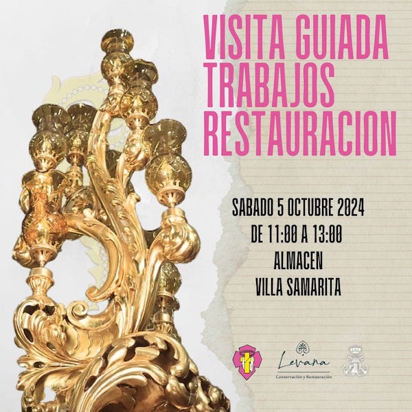El próximo sábado 5 de octubre de 2024, de 11:00 a 13:00 horas, tendrá lugar la apertura extraordinaria de los almacenes de Villa Samaritana (Calle Mahón) para ver de cerca los trabajos de restauración del trono de la agrupación de la mano de los técnicos que la están llevando a cabo.