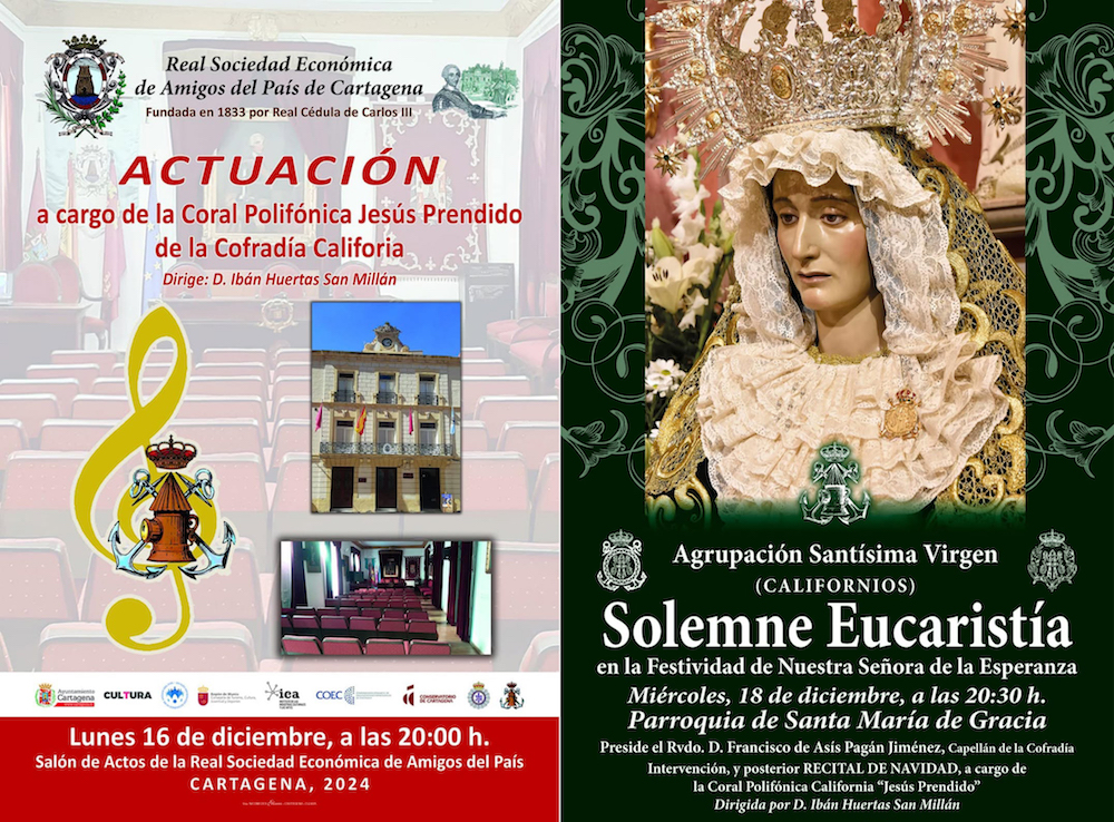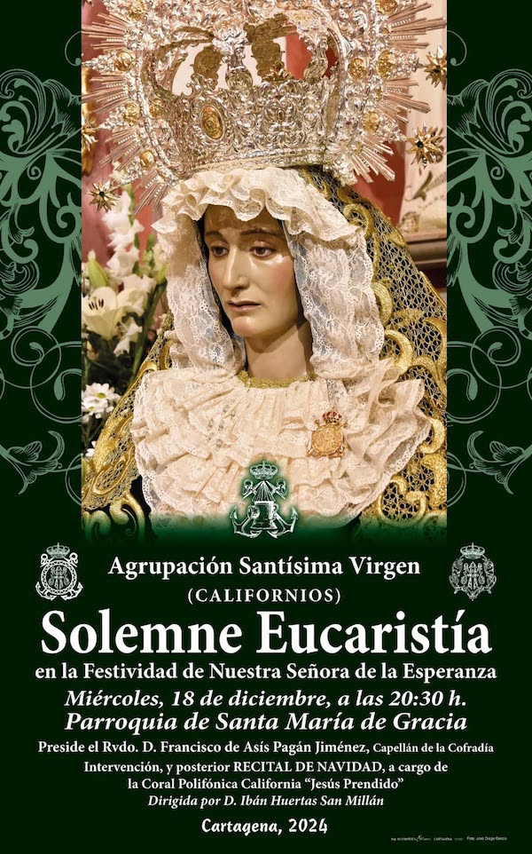 Por otro lado, indicar que este miércoles será la misa en Santa María con motivo de la festividad de la Virgen de la Esperanza (20.30 horas). Presidirá el reverendo Francisco de Asís Pagán Jiménez, capellán de la Cofradía California. Habrá un posterior recital de Navidad a cargo de la Coral Polifónica California 'Jesús Prendido' dirigida por  Ibán Huertas San Millán.
