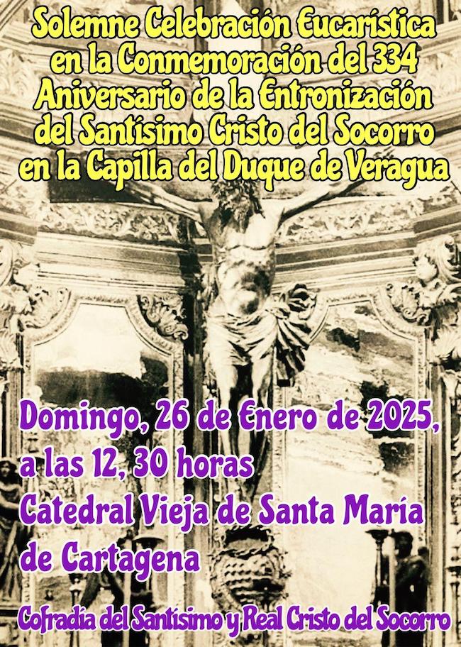 La Cofradía del Cristo del Socorro organiza este domingo por la mañana en la Catedral Vieja de Santa María de Cartagena, la solemne eucaristía del 334 aniversario de la entronización de la imagen del crucificado, desarrollándose la misma en la capilla de la hermandad, siendo oficiada por el capellán, Lázaro Gomariz López.