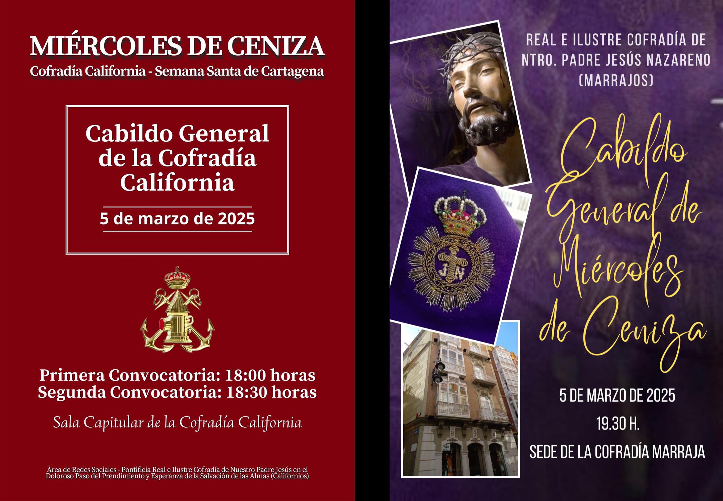 A las 19.30 horas comenzará el cabildo general de Miércoles de Ceniza en la sede de la Cofradía Marraja de la calle Jara. Por su parte, la Cofradía del Socorro suele utilizar el salón de actos de la Sociedad Económica de Amigos del País de la calle del Aire para esta reunión, mientras que la Cofradía del Resucitado lo hace en su sede de la calle Palas a partir de las 19 horas.
