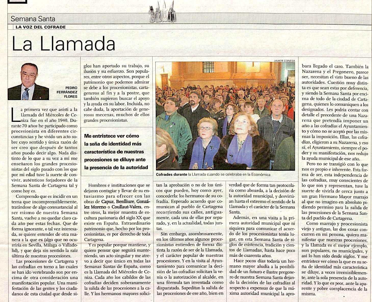 Reproducimos el artículo escrito por Pedro Ferrández Flores, fallecido en 2018 y quien fue hermano mayor de la Cofradía Marraja durante 8 años, en el año 2010 y que fue publicado por el diario La Opinión, en el que expresa el sentido del tradicional acto del 'Miércoles de ceniza'.