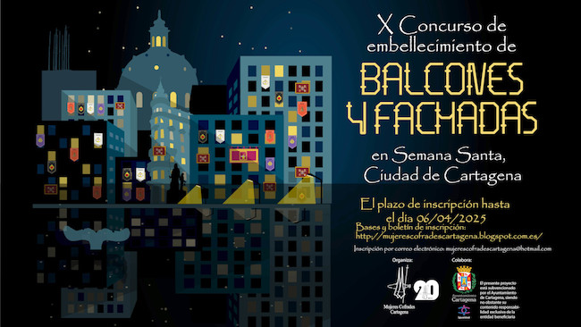 La Asociación Mujeres Cofrades de Cartagena vuelve a contar con la colaboración del Ayuntamiento de Cartagena en la convocatoria del X Concurso de Embellecimiento de Balcones y Fachadas de Semana Santa, cuyo objeto es realzar y decorar las calles durante la celebración de la Semana Pasional, declarada de Interés Turístico Internacional.