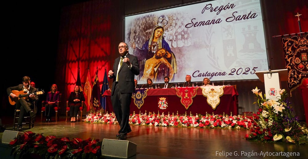 El pregón de la Semana Santa de Cartagena ha estado dividido en cuatro partes. Y ha servido para ensalzar algunas de las efemérides. Entre ellas, el centenario de la llegada a Cartagena de la Virgen de la Piedad. Una talla de popular devoción en Lunes Santo, que además protagoniza el cartel de este 2025.