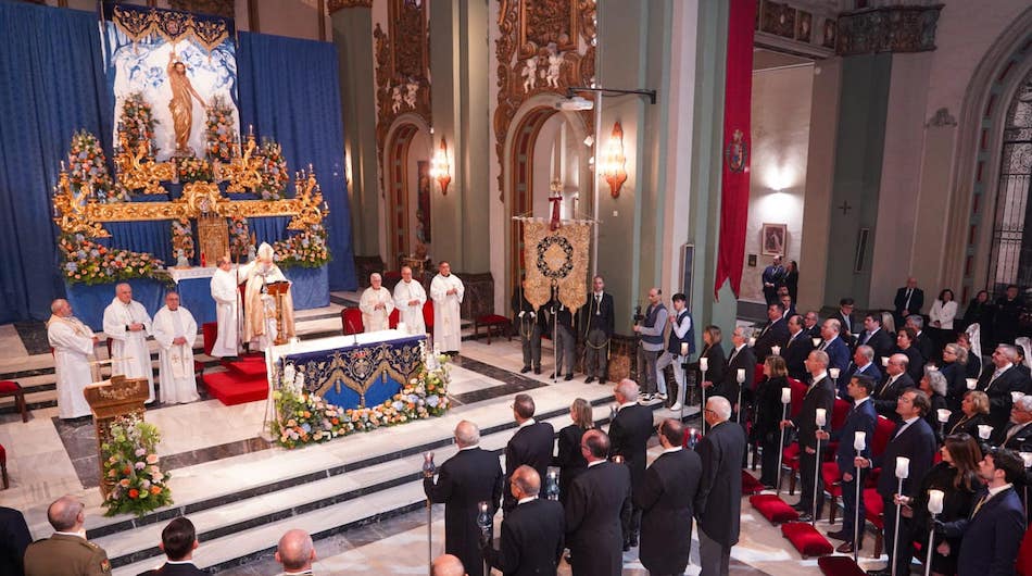 La Cofradía de Nuestro Padre Jesús del Resucitado celebró su principal acto litúrgico de cada año, el cual fue oficiado por el obispo, monseñor Lorca Planes, y ofreció, además del engalanamiento floral, el novedoso adorno de altar con elementos del trono dorado del titular, el estreno de un incienso que será exclusivo para este oficio.