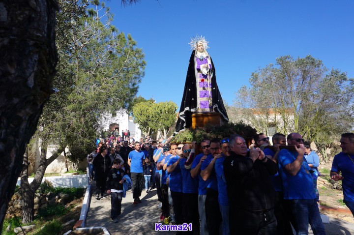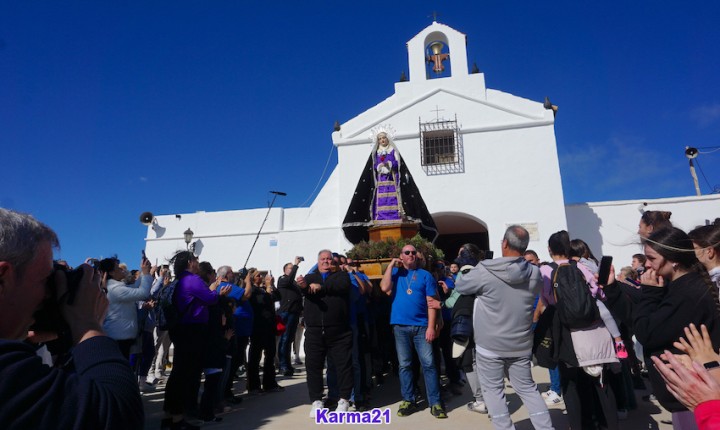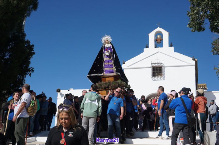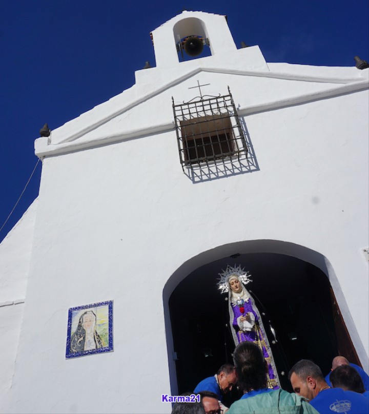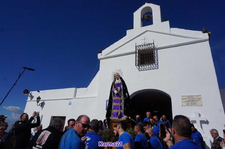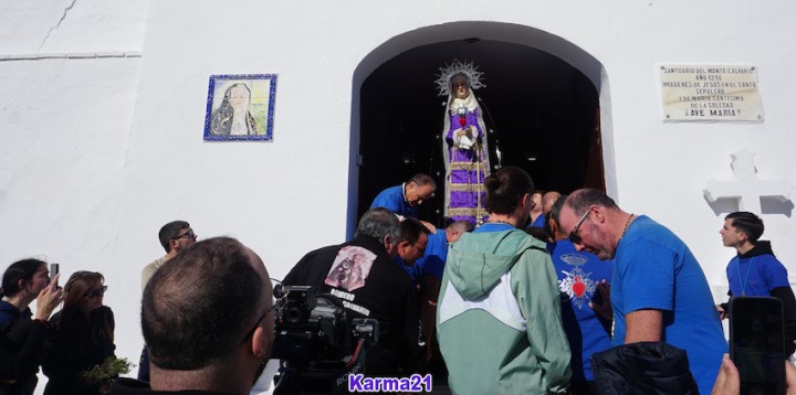 "¡Vamos a darle el prestigio y el honor a la Virgen, lo llevamos en la sangre". Es el mensaje que se han lanzado entre los costaleros momentos antes de su salida de una ermita que luce especialmente su blancura en esta ocasión tras la labor de pintado que llevaron los hermanos de la Cofradía de la Soledad del Monte del Calvario.