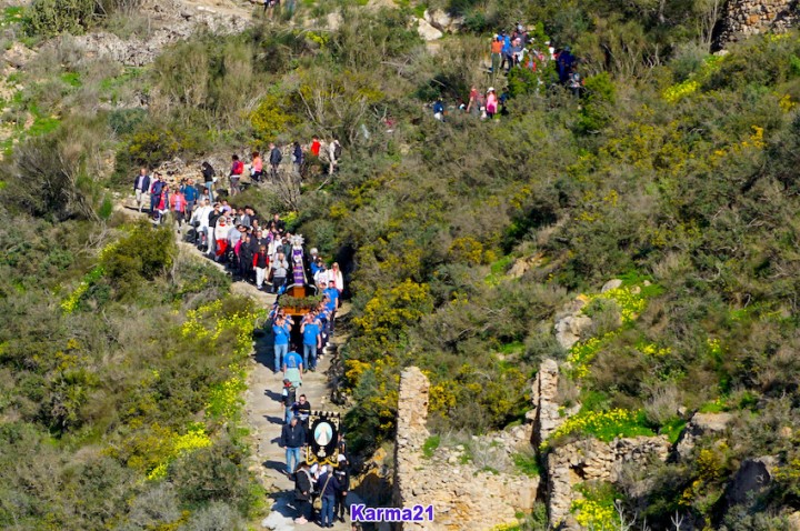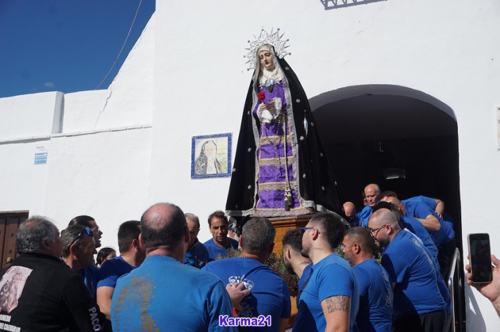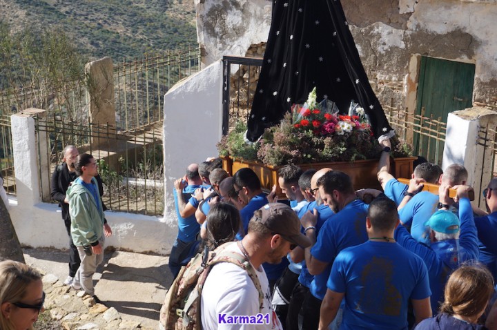 "¡Oído, Viva la Virgen!". Con puntualidad, a las cuatro de la tarde, las varas de la peana que lleva a la madre de Dios se ubican sobre los hombros de las personas que serán sus 'pasos', cruzando enseguida el pórtico mientras se escucha el repique de las restauradas campanas instaladas hace escasas fechas. Por cierto, otra novedad de este año es que se ha estrenado como párroco del lugar el reverendo Lázaro Gomariz.
