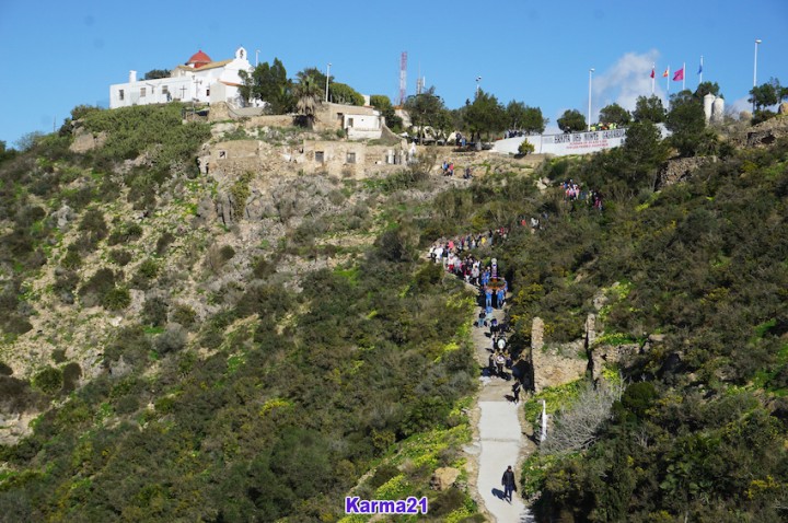 Unas cuatrocientas personas (quizás más) esperan a la Virgen, formando un pasillo hasta que la peana se coloca en cabeza para empezar el descenso por el monte y pasan a ser su estela de cariño ante una imagen que, casi un año después, vuelve a recibir los rayos del sol.