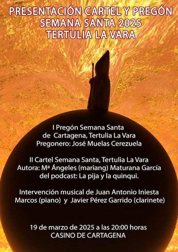El pregón y la presentación del cartel de Semana Santa de Tertulia La Vara comenzará a las 20.00 horas del próximo día 19, en el Casino de Cartagena (calle Mayor). Acceso libre hasta completar aforo.