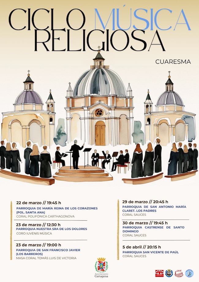 Coral Polifónica Carthagonova, Coro Iuvenis, Masa Tomás Luis de Victoria y Sauces llevarán la música religiosa desde hoy y hasta el 5 de abril a las parroquias del Polígono Santa Ana, Los Dolores, Los Barreros, Los Padres Claretianos, Santo Domingo y San Vicente de Pául.