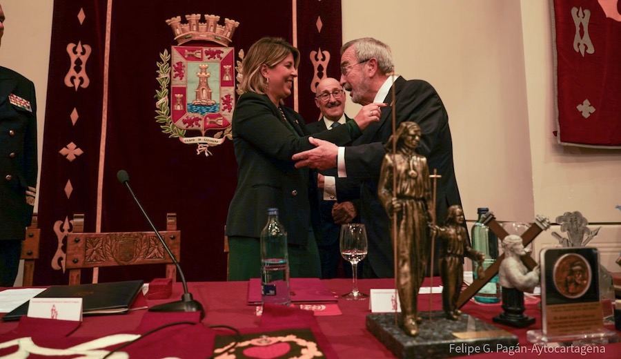 Durante el acto, además de leerse una semblanza del homenajeado, Agrupaciones, Cofradías e instituciones cartageneras de diferentes ámbitos han entregado obsequios al Procesionista en reconocimiento por su nombramiento y como cierre, la alcaldesa ha impuesto el Escudo de Oro de la ciudad al galardonado.