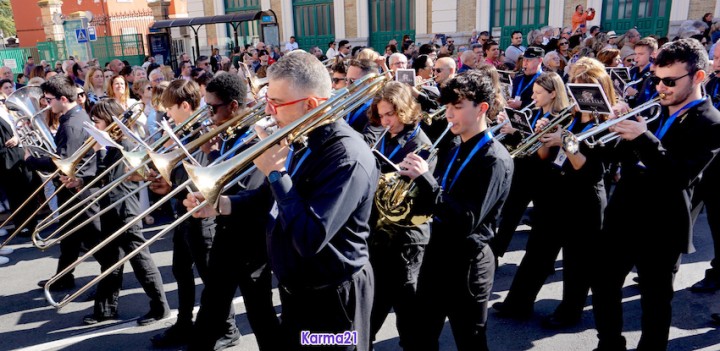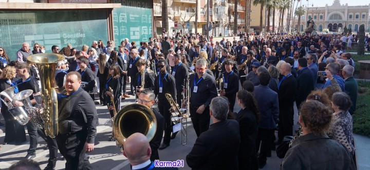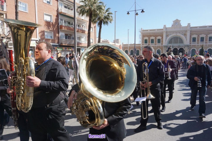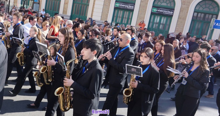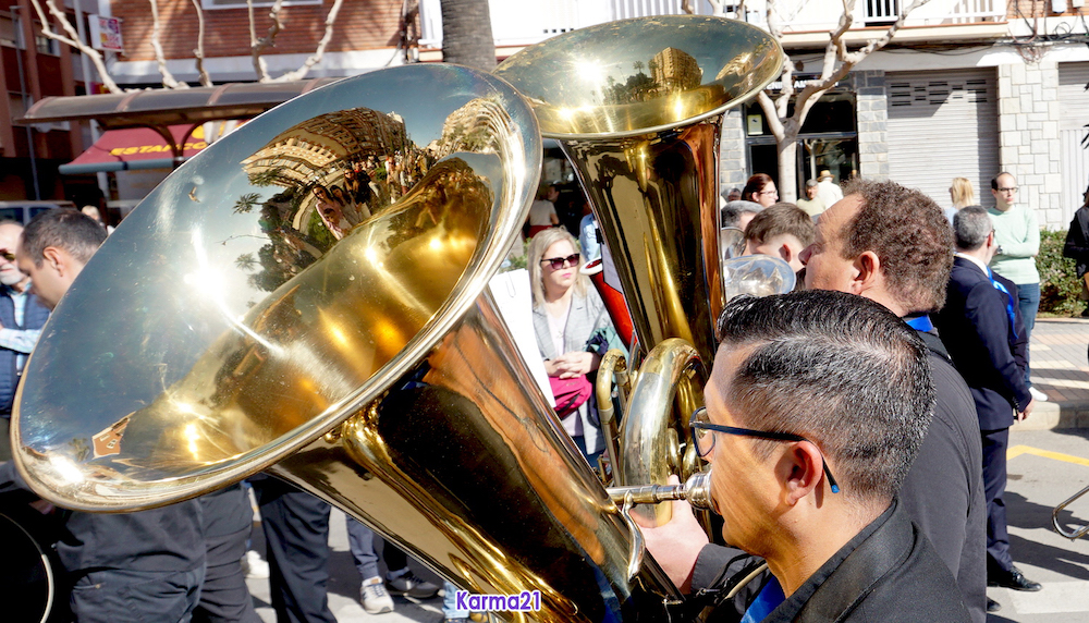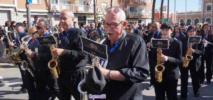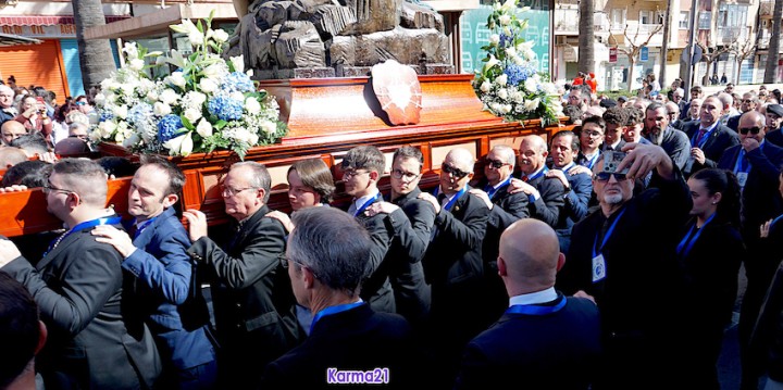Un millar de personas, no todos procesionistas, han llevado a la 'Caridad Chica' desde la estación de tren hasta Santa María, como sucedió el 6 de abril de 1925 cuando llegó la imagen. La marcha la han abierto una gran banda formada por músicos voluntarios de la comarca y los relevos de portapasos se han efectuado cada cine metros.