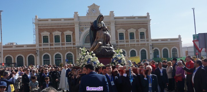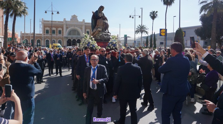 Cientos de personas han acudido a ver salir a la Virgen de la Piedad desde la estación de tren, tal y como sucedió hace justamente un siglo con autoridades religiosas y civiles encabezando la bienvenida popular a la nueva imagen creada por José Capuz.