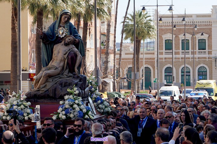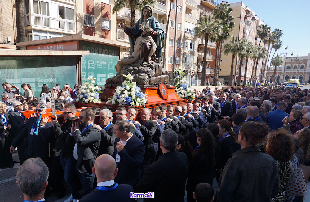 Itinerario: Avenida de América, Puerta de San José, San Diego, plaza de la Merced, Duque, plaza de San Ginés, San Francisco, Campos, San Miguel, Aire, Cañón, Príncipe de Vergara, Subida de las Monjas, plaza del Ayuntamiento, Mayor, plaza de San Sebastián y Aire, hasta su recogida en la Iglesia de Santa María. Sobre la una de la tarde ha llegado a la plaza del Ayuntamiento, donde ha sido recibida por la alcaldesa de Cartagena (se ha sumado después al cortejo), por la corporación municipal y por los Granaderos californios al son del himno nacional y le entregaron un ramo de flores. En este punto, la alcaldesa Noelia Arroyo, acompañada por miembros de la corporación municipal, recibió a la imagen y le hizo entrega de un obsequio muy especial: una reproducción, tallada en madera, del escudo municipal de 1925, obra del artesano Juan Miguel Cervilla, que la Virgen portó hasta su entrada en Santa María. Noelia Arroyo recordó que "desde ese momento hace 100 años que apareciste en la Estación, conectaste íntimamente con tu pueblo, rendido y devoto que decidió escoltarte en masa por las calles de Cartagena, tradición y devoción que año a año ha ido creciendo. Cartagena reconoció en tí a la madre y desde entonces a la Virgen de la Piedad forma parte del patrimonio emocional de todos los cartageneros, del río de promesas que te acompañan todos los Lunes Santos, de los devotos que tenemos venerado durante un siglo, de quienes fundieron sus propias joyas para ponerte la corona y el corazón de plata".