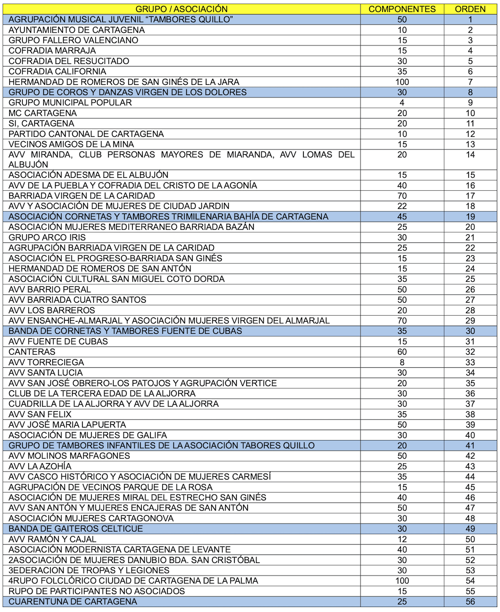 El desfile previo a la ofrenda se concentrará en la Plaza de Ayuntamiento a las 16:30 horas, saliendo a las 17:00 horas para recorrer las calles Mayor, Plaza de San Sebastián, Puerta de Murcia, Santa Florentina, Parque, Plaza Puertas de la Serreta, Serreta e Iglesia de la Caridad.