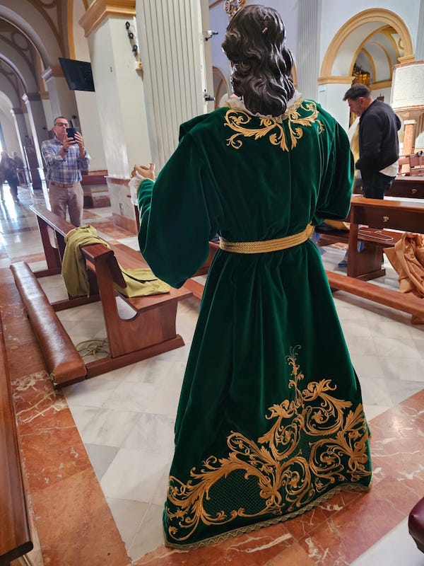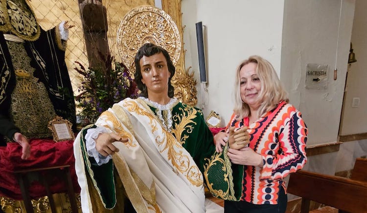 La imagen del Discípulo Amado de la Cofradía del Cristo de la Divina Misericorida lucirá este Viernes de Dolores por la tarde un nuevo vestuario, que ha sido donado por Mayte Malavia Ferrando, camarera de honor la imagen desde el año 2015 y a quien se observa en la imagen superior durante el acto de la vestida de la talla del santo en el día de hoy.