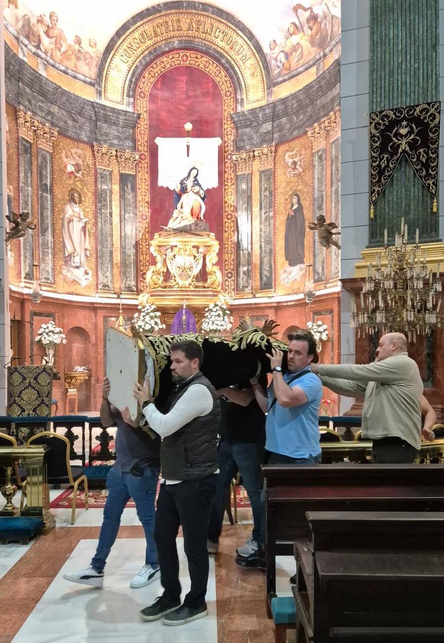Reportaje fotográfico de las dos jornadas previas a la celebración esta tarde del vía crucis por el casco histórico, con escenas del traslado del Cristo de la Divina Misericordia desde la Caridad hasta a capilla de la plaza de la Merced, donde ha tenido lugar la vestida de las tallas.