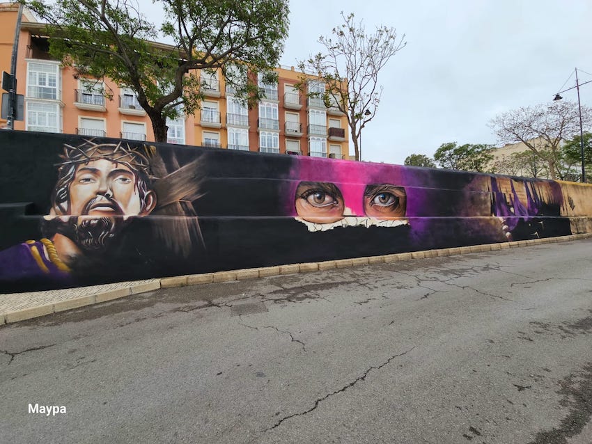 El rostro de titular de la Cofradía Marraja y una muestra de su tercio de penitentes ya luce en la pared de la subida de la plaza del Pescador, que es por donde pasa 'el Jesús del madero' en la madrugada del Viernes Santo hacia el 'encuentro' con 'La Pequeñica'.