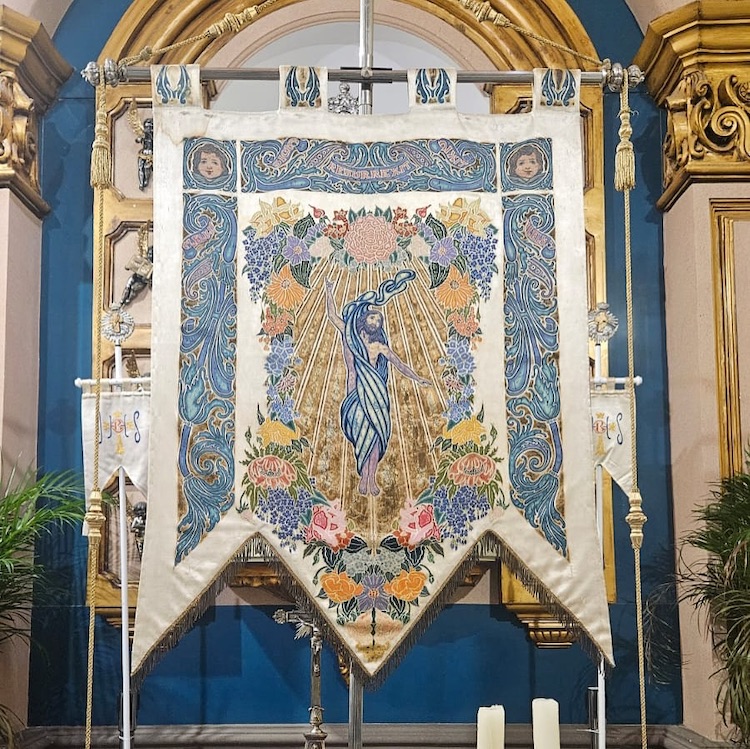 El sudario fundacional de 1943, obra del pintor cartagenero Vicente Ros, abrirá la procesión portado por un tercio de penitentes ataviado con vestuario inspirado en la época fundacional. No faltarán momentos emotivos como las petaladas y lanzamiento de aleluyas desde el edificio de la familia Boj, en la puerta de la Serreta —donde se encuentran los mosaicos cerámicos del Resucitado y la Virgen del Amor Hermoso— y desde la Real Sociedad Económica de Amigos del País a la recogida.