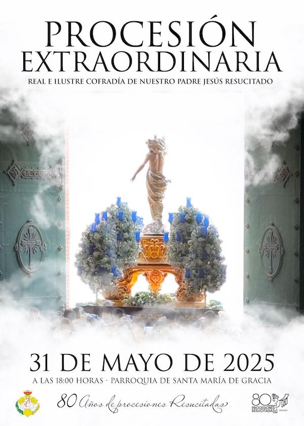 Hoy, a las 18:00 horas saldrá desde la iglesia de Santa María de Gracia la Procesión Extraordinaria del 80 aniversario, que recorrerá gran parte del itinerario original de 1945. La imagen de Nuestro Padre Jesús Resucitado será acompañada por una nutrida comitiva de penitentes, portapasos, heraldos, formaciones musicales y momentos de especial carga simbólica y emocional.