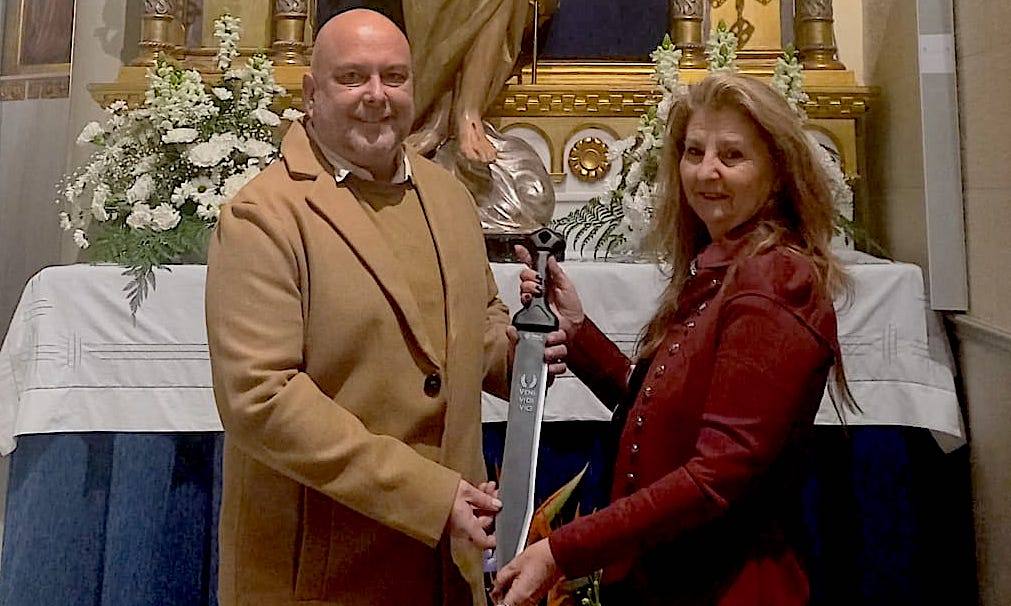 La agrupación de Soldados Romanos de la hermandad procesionista blanca ha nombrado a Pedro Zabala Montoya como padrino, lo que pudiera ser el primer caso que se da en la Semana Santa de Cartagena, pues no nos consta que haya precedentes. En la imagen se le observa recibiendo la gladio de honor de manos de la presidenta del colectivo, María Mínguez.