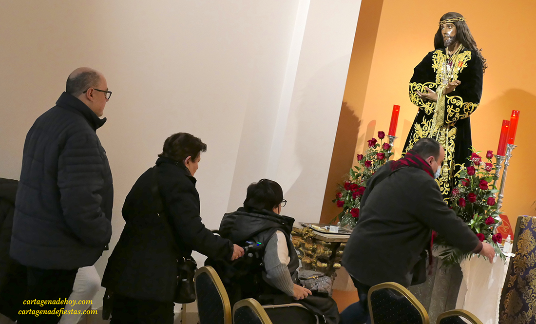 La amplia prenda fue costeada por suscripción popular y estrenada en el pasado mes de noviembre con motivo del hermanamiento con el Nazareno de La Unión y cubrirá la talla de Salzillo en su salida del Viernes de Dolores, por un 'camino de la cruz' que repetirá el recorrido ampliado de 2022. En la imagen, el presidente y algunos directivos en la reciente jornada de veneración a la imagen.
