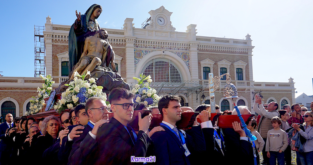 Un millar de personas, no todos procesionistas, han llevado a la 'Caridad Chica' desde la estación de tren hasta Santa María, como sucedió el 6 de abril de 1925 cuando llegó la imagen. La marcha la han abierto una gran banda formada por músicos voluntarios de la comarca y los relevos de portapasos se han efectuado cada cine metros.