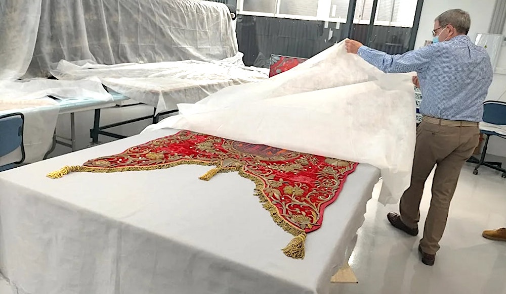 El sudario titular de la Cofradía del Cristo del Prendimiento de Cartagena, obra creada hace casi un siglo en el taller del Asilo de San Miguel, sigue su proceso de recuperación en un taller especializado de Sevilla, donde fue llevado el pasado mes de febrero. Los trabajos se centran en la recuperación del soporte y la reintegración total de la pieza y sus elementos, así como en la limpieza físico-química del bordado.