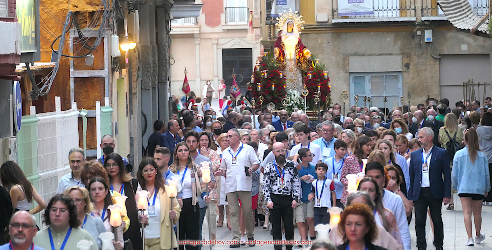 La Virgen del Primer Dolor ha recorrido, por vez primera desde 2019, las calles del centro de Cartagena con motivo de la 'Lucernaria' celebrada en el 75 aniversario de la llegada a Cartagena de la imagen creada por Mariano Benlliure, saliendo de Santa María con el canto de 'Santa María del camino'. GALERÍA DE FOTOS (pinchar aquí)