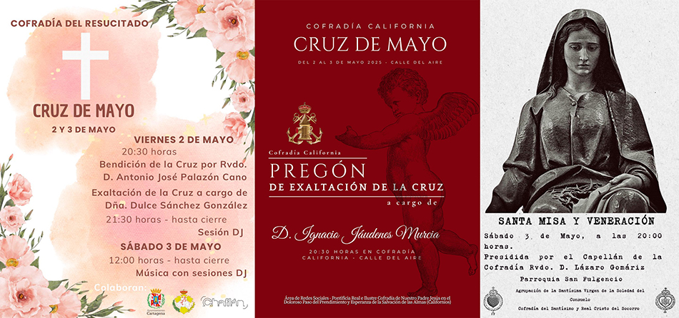 Dulce Sánchez e Ignacio Jáudenes ofrecen los pregones, respectivamente, de las cruces de mayo de las cofradías del Resucitado y del Prendimiento, que se inauguran hoy junto a sus sedes del centro histórico de Cartagena. Por su parte, hay misa en honor a la Virgen de la Soledad del Consuelo de la Cofradía del Socorro.