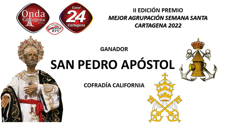 El colectivo sampedrista de la Cofradía California ha sido el que más votos ha recibido en la segunda edición del concurso que organiza Onda Cartagena-Canal 24TV (Gaceta RTV). El premio será entregado en el transcurso del programa radiofónico ‘Las mañanas de gaceta’ el miércoles 4 de mayo, a las doce horas, en el salón de actos del colegio Miralmonte, siendo entregado por la vicealcaldesa de Cartagena, Ana Belén Castejón.