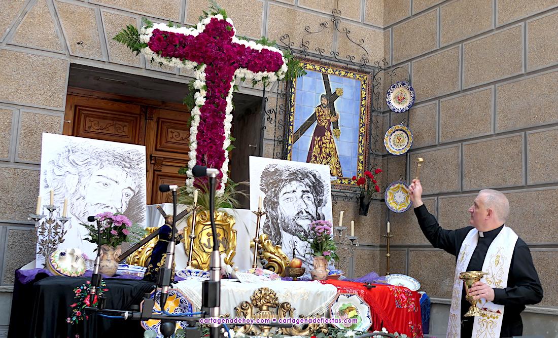 La Cofradía Marraja, pionera en la celebración de las cruces de mayo, monta doblete este año con la cruz instalada en el Callejón de Bretau, donde el capellán ha efectuado la bendición y Beatriz Saura ha ofrecido el pregón, y la novedosa cruz de la calle Cuatro Santos frente a lo que será su museo procesionista.