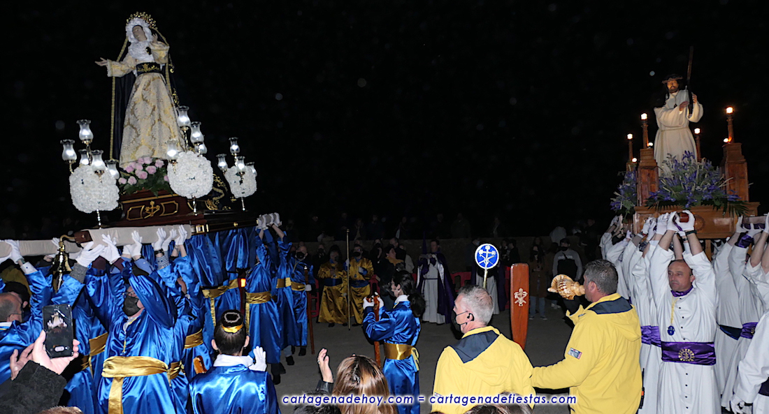 Cartagena volvió a sentir el embrujo de su noche más cautivadora, en la que miles de personas se movilizaron en torno a una procesión con diferentes salidas, para confluir en la plaza de la Merced para presenciar el momento en que el Nazareno se encuentra con su madre. La foto superior muestra el tradicional contacto entre los portapasos de la Virgen y de San Juan minutos antes del encuentro de 'La Pequeñica' con su hijo. GALERÍA DE FOTOS (pinchar aquí).