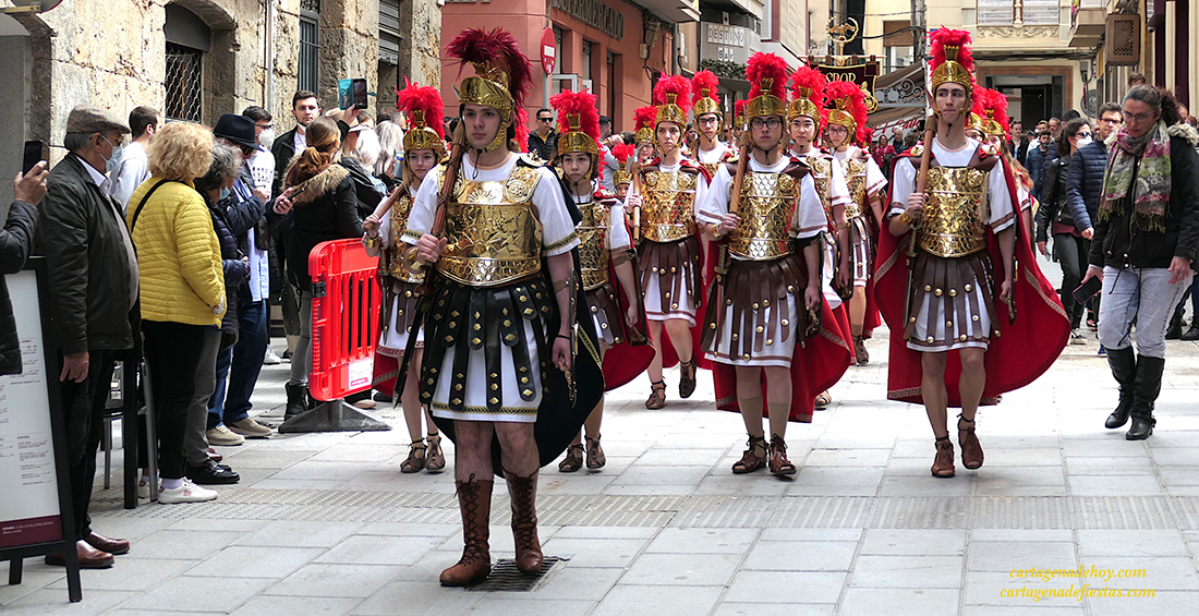 Granaderos y romanos, principalmente, han animado las calles del casco urbano de Cartagena, al margen de las procesiones, con diversos pasacalles, que se han convertido en atractivos alicientes para los visitantes que recibe la ciudad. En la imagen se observa a la sección infantil de los ‘judíos’ californios en la mañana del Jueves Santo.