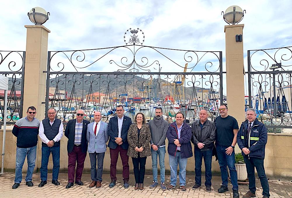 Los portapasos de la Virgen de los Dolores de la Cofradía Marraja tienen desde hace unas fechas su emblema ubicado en la valla de la pescadería de Santa Lucía. En la imagen, integrantes de la agrupación posan con la presidenta de la Autoridad Portuaria, Yolanda Muñoz, tras la instalación.