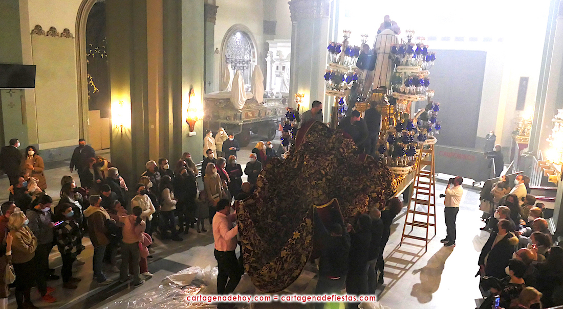 Cartagena de Hoy ofrece el paso a paso de cómo el más grande manto de la Semana Santa de Cartagena se ubica en la imagen de la Virgen del Primer Dolor de la Cofradía California, en un cautivador acto reservado a los hermanos de la agrupación y que se lleva a cabo cada año tras salir la Virgen de la Piedad de Santa María en la noche del Lunes Santo. De terciopelo rojo y de 7 metros de longitud, tiene un peso aproximado de 75 kilos, bordado en oro en los talleres de la Misericordia por la artesana Anita Vivancos en el año 1960, según dibujo de Balbino de la Cerra Barceló.