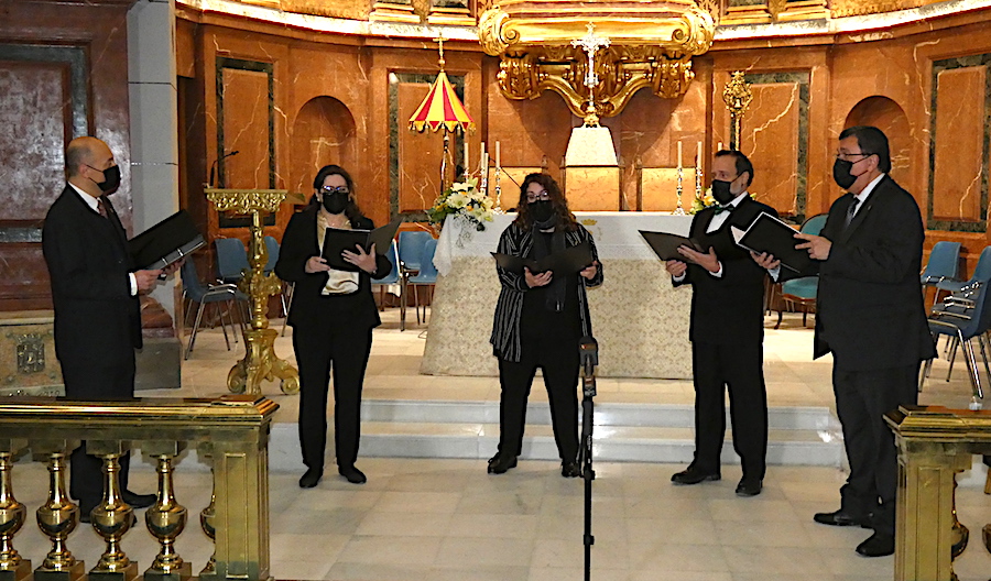 La Basílica de Nuestra Señora de la Caridad acogió la presentación de la publicación 'Arriba el trono' editada por la Agrupación de Portapasos Promesas de la Santísima Virgen de la Piedad (marrajos) y coordinada por José Javier Inglés Viñas. El portapasos Juan José Guillén Maturana glosó el contenido de la revista, salpicándolo anécdotas de la Semana Santa. El numeroso público también asistió al estreno de la adaptación, a cuatro voces, de la tradicional marcha 'Plegaria', que acompaña a La Piedad en su recorrido por la ciudad, obra de Manuel Dimbwadyo.