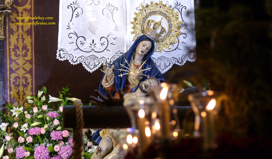 La agrupación, que sale en primera procesión california de la noche del Viernes de Dolores, ha recibido un pañuelo de hilo con tiras caladas de bolillo y encaje valencienne, realizado por Juan Carlos Romero a partir de un delantal de principios del siglo XX donado al colectivo pasionario por Leonardo Bodalo, procedente del ajuar de su abuela María Gabarron Osete. También son novedades este año el escapulario con los escudos de Infantería de Marina y Policía Naval (donados por estos cuerpos en el XXV aniversario de la bendición de la imagen) y un rosario de plata y cristal azul del siglo XXI, además de las galas de los tambores bordadas sobre raso azul.