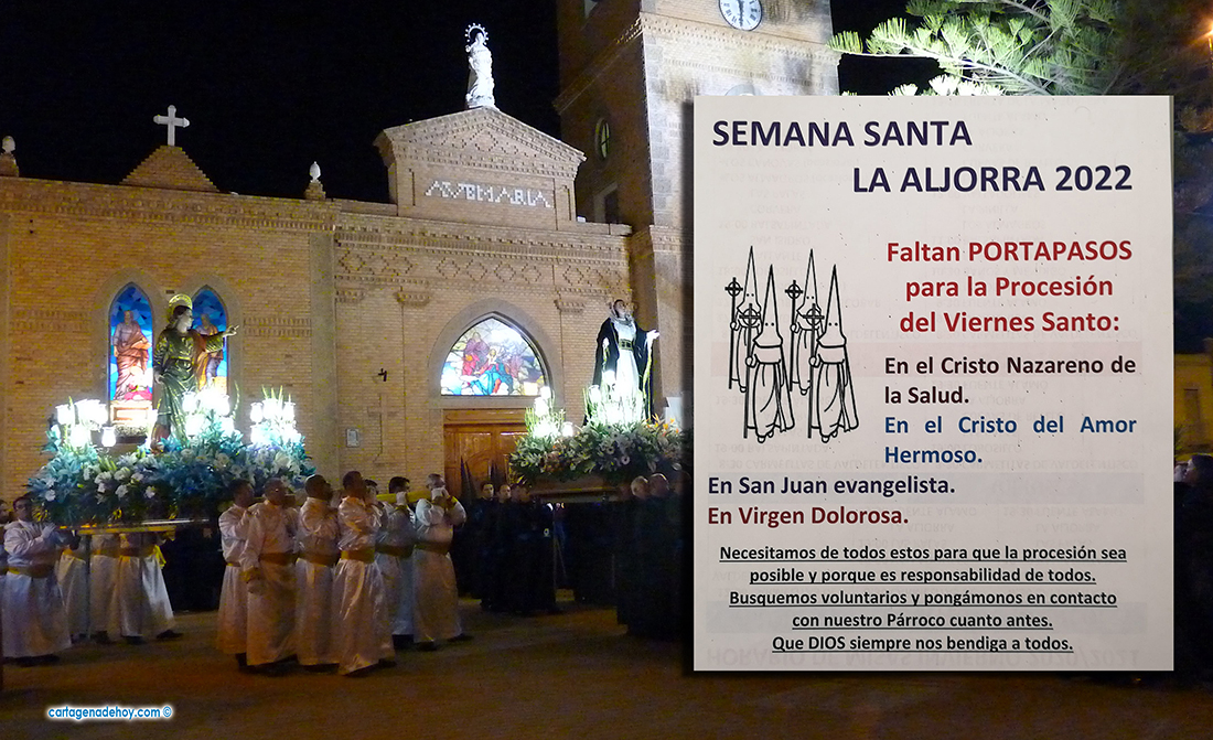 Tras el paréntesis generado por la pandemia, el mundo procesionista cartagenero se apresta a recuperar sus desfiles, pero en los pueblos del municipio está siendo un gran calentamiento de cabeza la falta de costaleros. En El Algar ha motivado que se suspenda la salida de tres tronos en el Jueves Santo y en La Aljorra (foto adjunta) se lanza un llamamiento a los vecinos para no seguir los mismos pasos. En otros lugares, como La Puebla son optimistas, pero tienen preparadas ruedas para sus tronos si no completan el número mínimo, que ya tiene Alumbres, pero que piden voluntarios para ampliarlo. Esta problemática también se da en alguna de las agrupaciones de las cuatro cofradías principales.