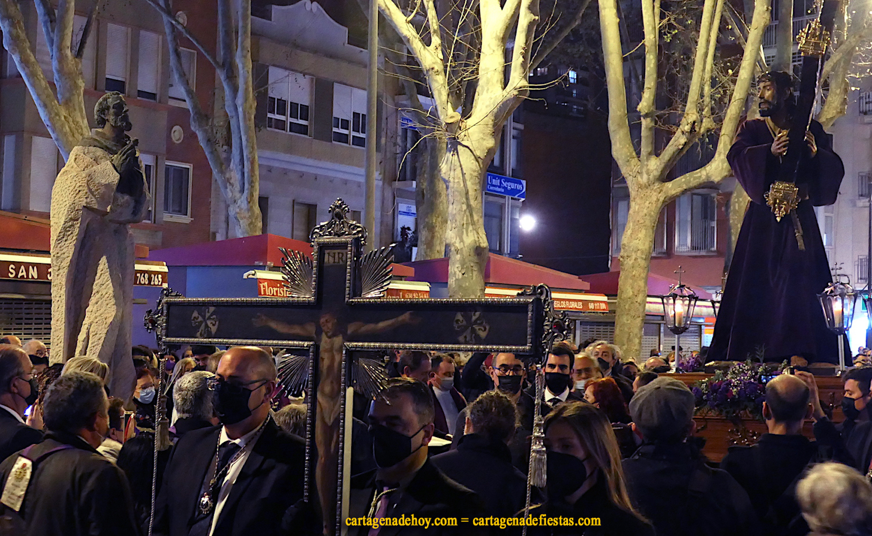 Jesús Nazareno ha recorrido sobre hombros de grupos de portapasos (la mayoría mixtos de ambos sexos) el casco histórico en un vía crucis organizado por los marrajos para pedir por el fin de la invasión rusa, reuniendo a unas quinientas personas, entre las que estaban integrantes de las restantes cofradías pasionarias y Andriy Chornopyskyy, sacerdote ortodoxo del colectivo ucraniano en la comarca que ha denominado al Nazareno como "príncipe de la paz". En la imagen, un momento del alto efectuado ante la estatua de San Francisco de Asís.