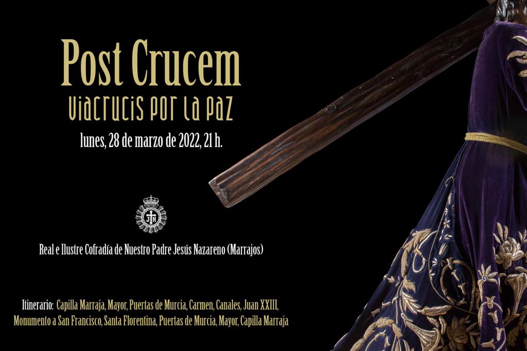 La Cofradía de Nuestro Padre Jesús Nazareno ha organizado un 'camino de la cruz' por el fin de la guerra en Ucrania y en el mundo, que tendrá lugar esta noche, a partir de las 21:00 horas, desde la capilla marraja de la parroquia castrense de Santo Domingo y ruta por Puerta de Murcia, calles Carmen y Canales, plaza de Juan XXIII, Santa Florentina y nuevamente por Puerta de Murcia y calle Mayor hasta recogerse en su capilla. Se hará una parada en la plaza Juan XXIII para rezar una oración ante el monumento a San Francisco de Asís.