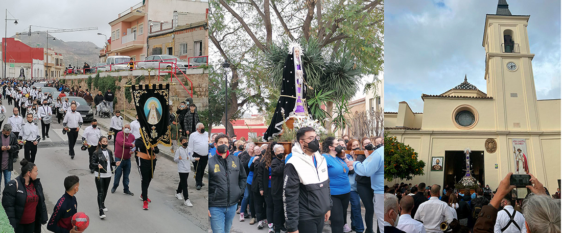 Numerosos fieles han acompañado esta tarde a la Soledad desde su ermita hasta la parroquia de Santa Lucía, en una romería que no tenía lugar desde 2019 y cuyo paso abrían el estandarte y la banda de música.