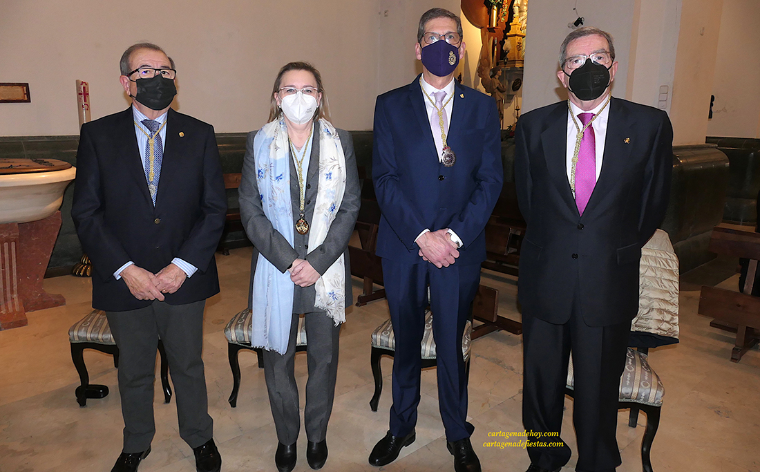 La Junta de Cofradías de la Semana Santa de Cartagena, integrada por representantes de las cuatro principales hermandades pasionarias de la ciudad (a cuyos hermanos mayores se observa en la foto adjunta), ha acordado que los costaleros que vayan sin rostro cubierto, dada la proximidad entre ellos, lleven el sistema de protección sanitaria más eficiente. Algunas agrupaciones se plantean pedir un test de antígenos para los portadores del trono.