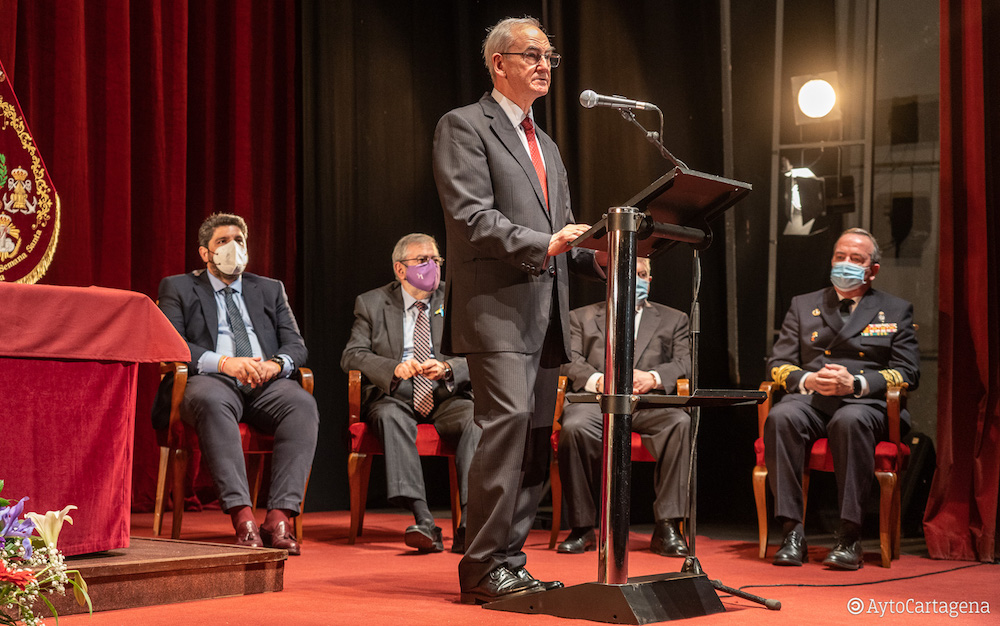 El jefe del Estado Mayor de la Defensa (JEMAD), el cartagenero Teodoro Esteban López Calderón, ha pronunciado un pregón emotivo y personal en el que recordado su infancia en la ciudad portuaria y el sentimiento de los cartageneros ausentes, además de poner en valor los actos que componen la semana grande de “nuestras cofradías pasionarias”, resaltando el regreso este año de las procesiones a la calle.