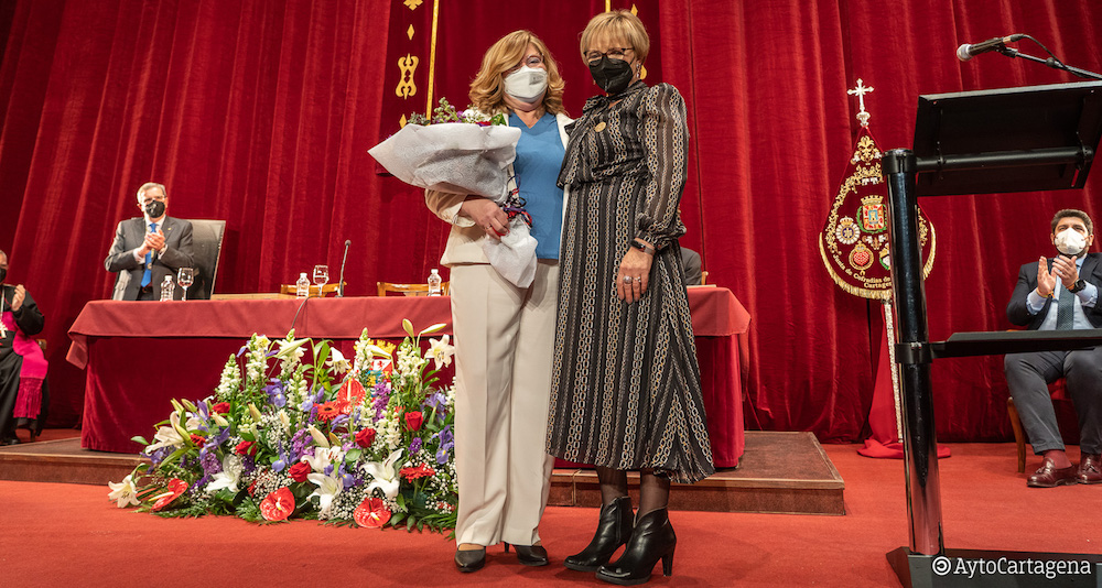 "Ojalá cada mujer de la Semana Santa cartagenera pudiera vivir ese momento", ha expresado en su oratoria una cartagenera con 56 años de sentimiento y actividad procesionista, quien ha anunciado que compartirá sus especiales momentos de este año junto a su predecesora, Manoli Borrego (con quien se la observa en la imagen adjunta), quien no pudo hacerlo en su momento por la irrupción de la pandemia.