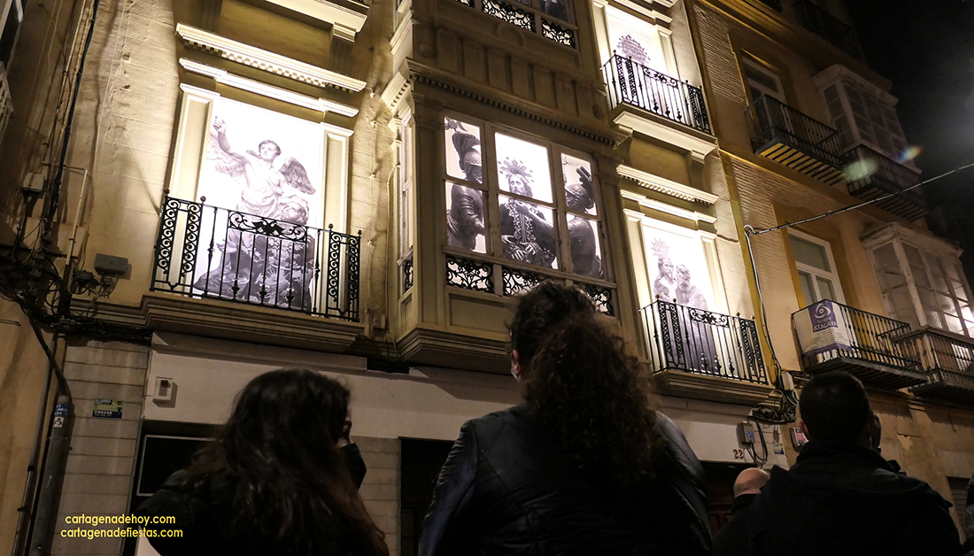 La Cofradía California abrió los actos de su 275 aniversario con el encendido de la fachada de su nueva sede en el edificio de ‘La espiga de oro’, donde lucirán, hasta junio de 2023, fotografías a gran tamaño de las ocho primeras tallas que tuvo la hermandad.