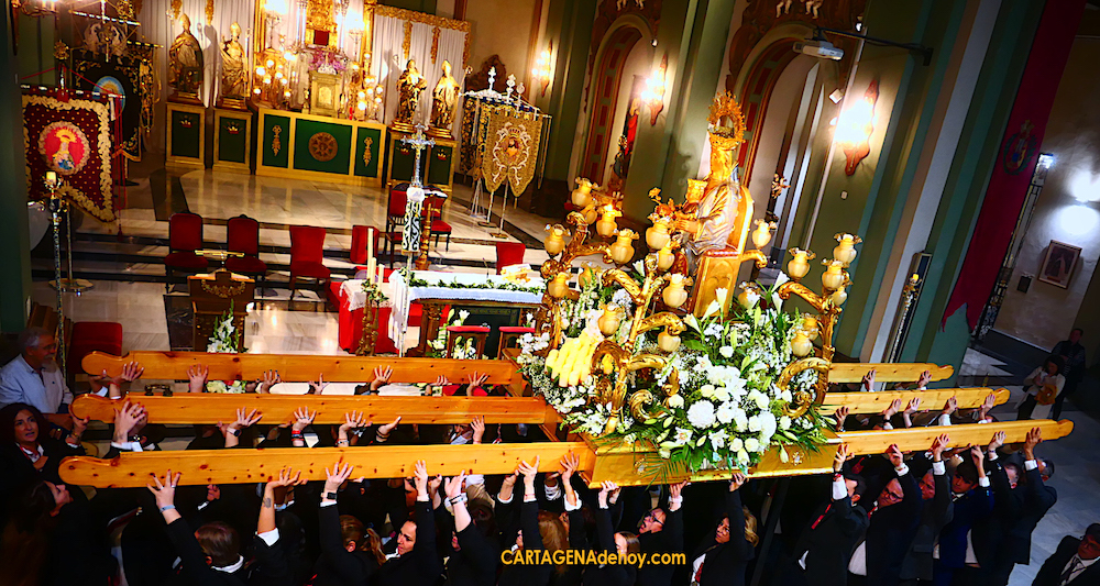 La tradicional misa en honor a la Santísima Virgen de la Soledad de los Pobres en la lonja de Pescadores de Cartagena se celebró con una alta participación de devotos y un espectacular altar creado para la ocasión.