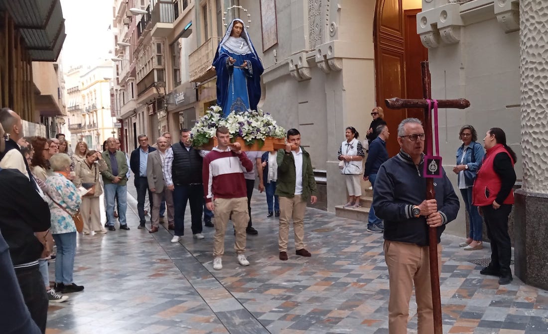 La Agrupación de la Soledad del Consuelo de la Cofradía del Socorro celebró ayer, a primera hora de la mañana y con motivo del 'mes de María', el traslado de la imagen desde Santo Domingo hasta la capilla del colegio del Patronato del Sagrado Corazón, un acto que va ganando adeptos cada año, notándose especialmente jóvenes, como destaca su presidente, Enrique Blaya.
