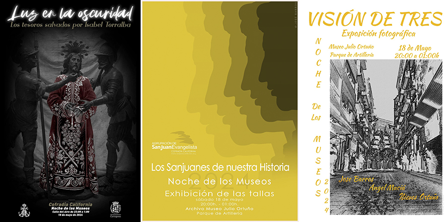 La Cofradía del Prendimiento ofrece en la noche del sábado, en su sede de la calle del Aire, la exposición ‘Luz en la oscuridad. Los tesoros salvados por Isabel Torralba’, mientras que San Juan Evangelista ofrece, de las 20 horas, 'Los sanjuanes de nuestra historia' en el Museo Julio Ortuño del Parque de Artillería, mostrando las tallas que en algún momento han salido en procesión como el Discípulo Amado, incluidas las que están en Sucina y en Los Dolores, además de 'resucitar' la de Salzillo que fue destruida.